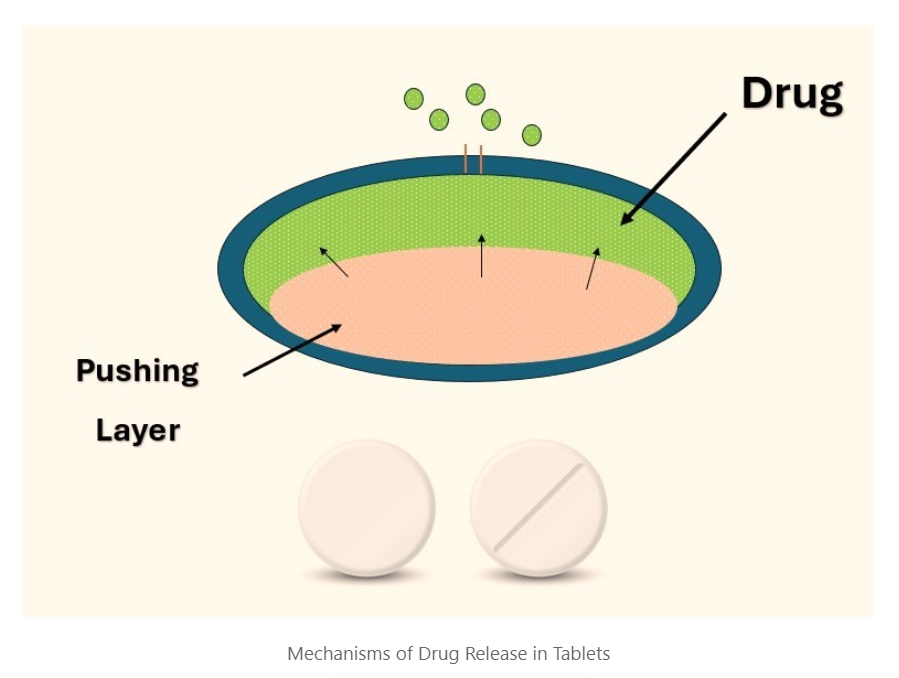 - Push-Pull Osmotic Pump (PPOP): Contains two layers – a drug layer and a push layer. The push layer expands upon water absorption, pushing the drug out.